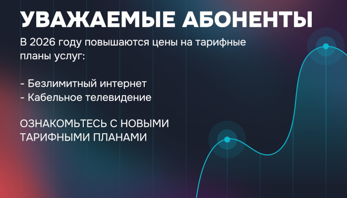УВАЖАЕМЫЕ АБОНЕНТЫ! Доводим до Вашего сведения, что с 1 января 2025 изменится абонентская плата за услуги интернет и кабельного телевидения. Ознакомьтесь с новыми тарифами.